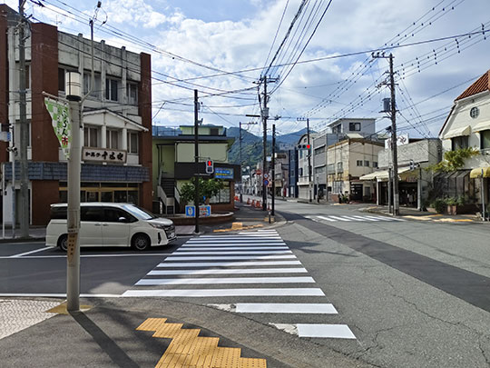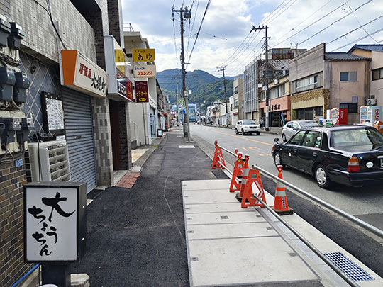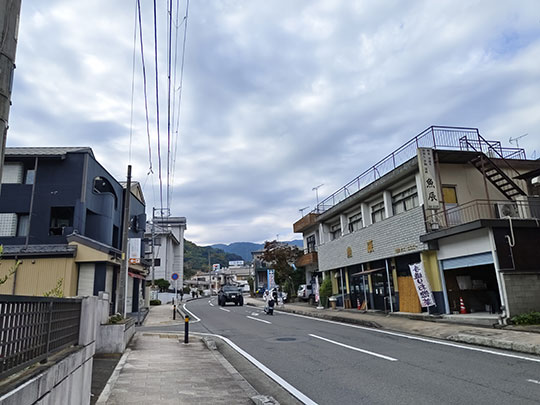 ถนนหน้าสถานีมีพวกร้านค้าอยู่ประปราย ในขณะที่มองไปเห็นภูเขา ดูสวยงามน่าเดินทีเดียว