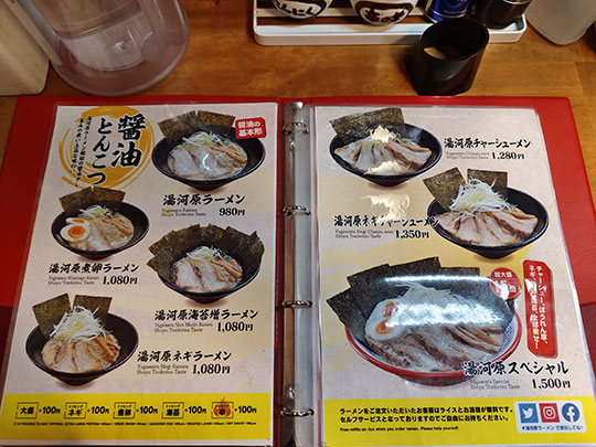 เมนู มีราเมงหลายแบบ แต่ที่ใช่ชื่อว่ายุงาวาระราเมงซึ่งเป็นเมนูหลักของร้านคือราเมงใส่โชวยุและกระดูกหมู
