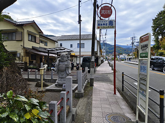 ป้ายรถเมล์ฝั่งตรงข้ามศาลเจ้ามีรูปปั้นเทพโฮเตย์ (布袋ほてい)