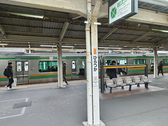 แล้วก็มาจอดที่สถานีฮิรัตสึกะ (平塚駅ひらつかえき) ในเมืองฮิรัตสึกะ (平塚市ひらつかし) แม้ว่าจะไม่ใช่สถานีที่เป็นจุดเปลี่ยนรถไฟ แต่เมืองนี้ก็เป็นเมืองใหญ่อีกเมืองของจังหวัดคานางาวะจึงมีความสำคัญ