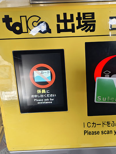 แล้วพอแตะบัตรก็เจอปัญหาดังที่ได้กล่าวไปข้างต้น ขึ้นว่าบัตรไม่สามารถคิดตังค์ได้ ให้เรียกเจ้าหน้าที่สถานี เพียงแต่ว่าที่สถานีนี้ไม่มีเจ้าหน้าที่ ทำให้เราทำอะไรไม่ได้ จึงได้แต่เดินออกจากสถานีมาโดยไม่ได้แตะบัตร ทำได้แต่รอไปจัดการที่สถานีถัดไปที่มีเจ้าหน้าที่