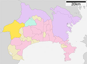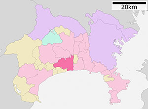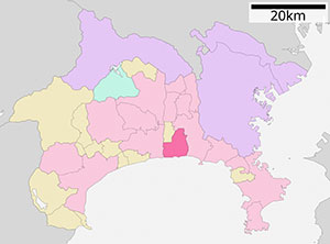 แผนที่แสดงตำแหน่งเมืองฮิรัตสึกะภายในจังหวัดคานางาวะเป็นสีชมพูเข้ม