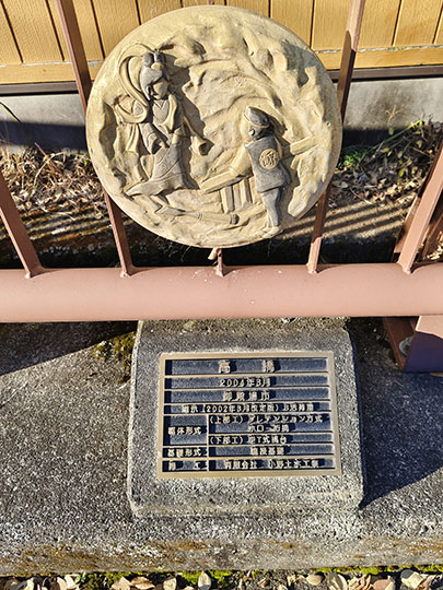 แผ่นป้ายแกะสลักที่อยู่บนราวสะพานนี้เล่าถึงตำนานของสะพานนี้ ซึ่งบอกไว้ว่ามีวังใต้น้ำอยู่ คล้ายในตำนานของอุราชิมะ ทาโรว