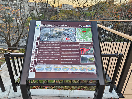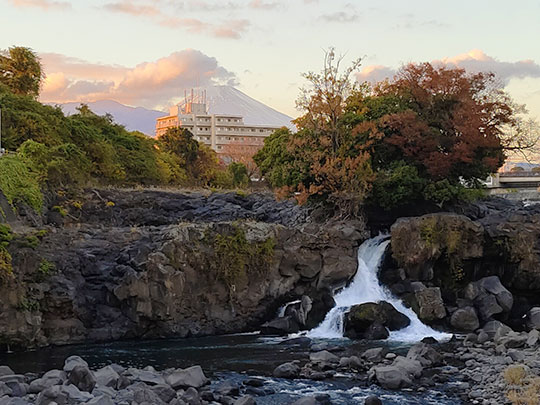 จากบนสะพานมองไปยังน้ำตก จังหวะนั้นเมฆบังภูเขาฟุจิอยู่