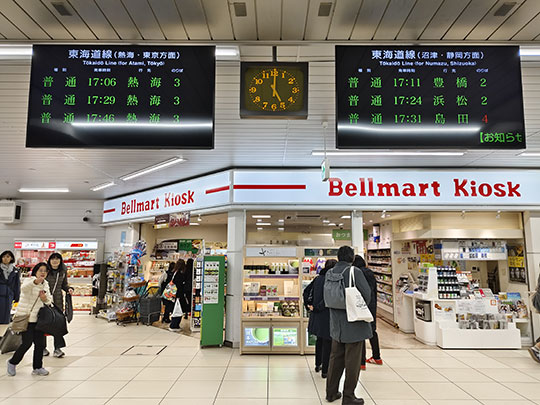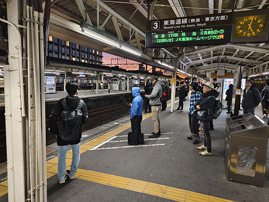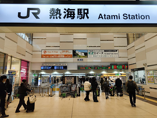 แต่ว่ารถไฟจากที่นี่ไม่สามารถข้ามไปยังจังหวัดคานางาวะได้ ต้องนั่งไปสุดที่สถานีอาตามิ (熱海駅あたみえき) ในเมืองอาตามิ (熱海市あたみし) แล้วจึงเปลี่ยนรถที่นั่น รถไฟจากที่นี่เกือบทั้งหมดไปได้แค่ถึงสถานีนี้ เที่ยวรถมีอยู่ไม่น้อย ครั้งนี้เรานั่งรอบ 17:06