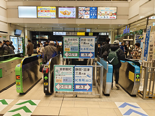 ตรงนี้เป็นที่ตรวจตั๋วออกจากสถานีอาตามิ จะเห็นว่ามีแบ่งเป็น ๒ ส่วน ๒ สี ไว้สำหรับคนที่มาจากคนละทาง เพราะว่าสถานีอาตามินี้เป็นจุดแบ่งเขตระหว่าง JR โทวไก กับ JR นิชินิฮง ไม่สามารถใช้บัตร IC ข้ามเขตได้ ถ้าหากนั่งมาจากทางตะวันออกให้แตะบัตรตรงที่ตรวจสีเขียวทางซ้าย ส่วนครั้งนี้เรามาจากทางฝั่งตะวันตก ต้องแตะบัตรที่สีฟ้าทางขวา