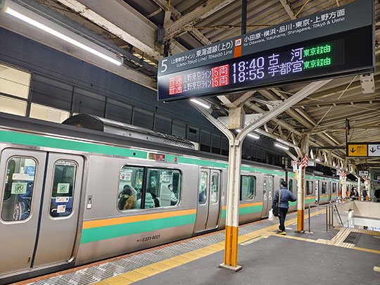 ได้นั่งรถไฟรอบ 18:40 ซึ่งเป็นสายอุเอโนะโตเกียว มีปลายทางอยู่ที่สถานีโคงะ (古河駅こがえき) ในเมืองโคงะ (古河市こがし) ของจังหวัดอิบารากิ นอกจากนี้ยังเห็นขบวนต่อไปที่มีปลายถึงอยู่ไกลถึงสถานีอุตสึโนมิยะของเมืองอุตสึโนมิยะจังหวัดโทจิงิที่เรากำลังจะไปอาศัยอยู่ด้วย นั่นหมายความว่าที่จริงถ้าเราไปอยู่ที่นั่นสามารถนั่งรถไฟสายนี้มาเที่ยวอาตามิและจังหวัดชิซึโอกะได้โดยไม่ต้องต่อรถที่ไหนเลย เพียงแต่ว่าระยะทางไกลมาก ต้องนั่งยาว ๓ ชั่วโมงครึ่งเลย ใช้ชิงกันเซงจะเร็วกว่า