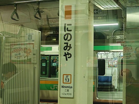 รถไฟยังมีจอดที่สถานีนิโนมิยะ (二宮駅にのみやえき) ในเมืองนิโนมิยะ (二宮町にのもやまち) ซึ่งตอนเช้ารถไฟที่นั่งก็ผ่านสถานีนี้แต่ว่าเพราะเห็นแบบด่วนก็เลยไม่ได้จอด ครั้งนี้ที่นั่งเป็นรถไฟธรรมดาที่จอดทุกสถานีก็เลยมีจอดที่นี่ ก็ขอถ่ายภาพเก็บไว้สักหน่อย