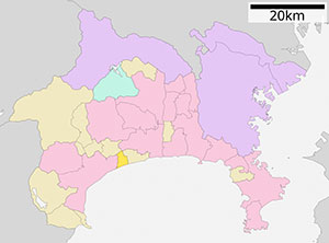 ตำแหน่งเมืองนิโนมิยะในจังหวัดคานางาวะ แสดงเป็นสีเหลืองเข้มเล็กๆค่อนไปทางซ้ายล่าง อยู่ถัดจากเมืองโอดาวาระ