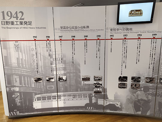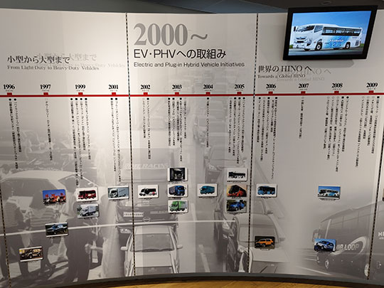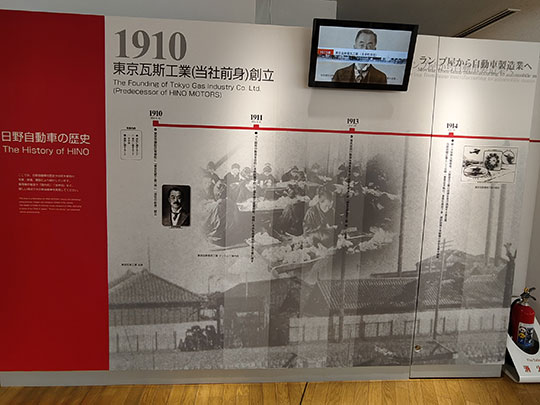 ผนังห้องนี้มีวาดเส้นเวลาแสดงประวัติศาสตร์ของฮิโนะ ไล่ตั้งแต่ปี 1910 ที่ยังเป็นบริษัทการไฟฟ้าและอุตสาหกรรมก๊าซโตเกียว