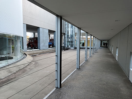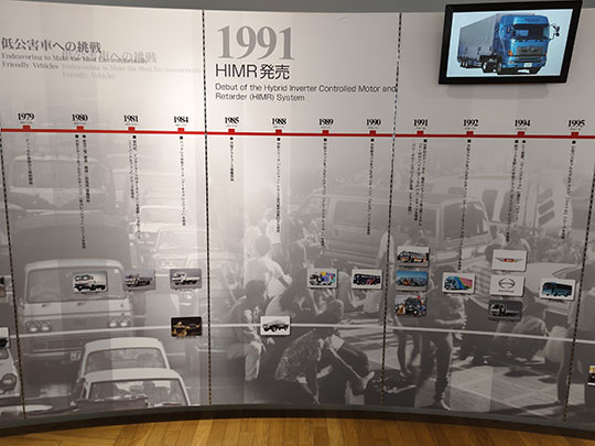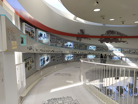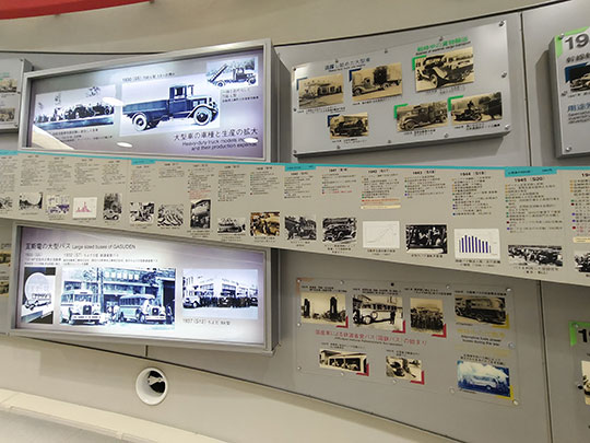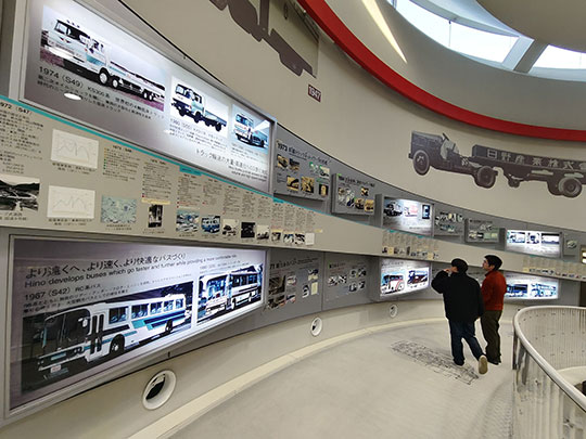 จากนั้นก็มาชมทางเดินเวียนที่เป็นทางลาดลงไปเรื่อยๆจากชั้น ๒ สู่ชั้น ๑ ตรงนี้เขียนเล่าประวัติศาสตร์ของรถยนต์ในญี่ปุ่นโดยละเอียด ไม่ได้เขียนแค่เฉพาะที่เกี่ยวข้องกับฮิโนะเท่านั้น ดังนั้นถ้าเดินไล่อ่านไปเรื่อยๆก็จะเข้าใจภาพรวมประวัติศาสตร์ของรถยนต์ในญี่ปุ่นได้
