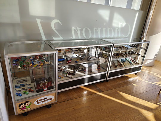 มีตู้ที่แสดงรถเล็กๆอยู่ในร้านด้วย