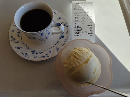 ตอนแรกแค่คิดว่าจะดื่มกาแฟ แต่เห็นว่าถ้าสั่งกาแฟแล้วสั่งขนมด้วยก็จะมีส่วนลด ๑๐๐ เยนก็เลยสั่งไอศกรีมด้วย ไอศกรีม ๒๕๐ เยน กาแฟ ๓๐๐ เยน ได้ลด ๑๐๐ เยน รวมเป็น ๔๕๐ เยน