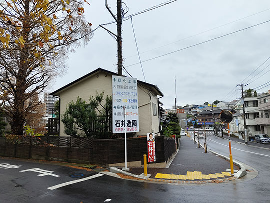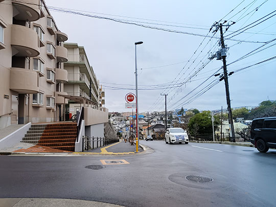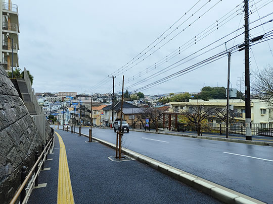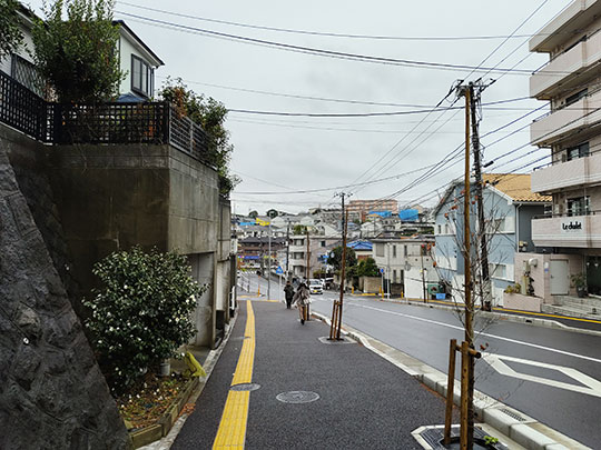 เดินจากหน้าสถานีไปทางตะวันตก พื้นกำลังเปียกเนื่องจากมีฝนตก แต่ว่าตอนนี้หยุดไปแล้ว