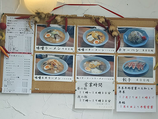 มีเมนูและภาพแปะอยู่หน้าร้าน ราเมงที่นี่เป็นราเมงมิโสะเป็นหลัก ไม่ได้มีอะไรเกี่ยวกับหมีแต่อย่างใด