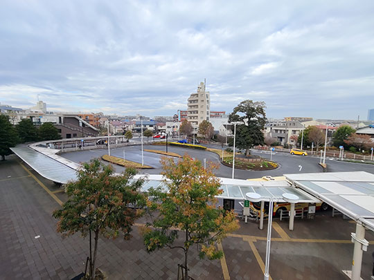จากบนสถานีมองออกไปยังย่านเมือง เห็นพื้นเปียกอยู่เพราะฝน แต่ว่าตอนที่ไปนั้นหยุดตกแล้ว