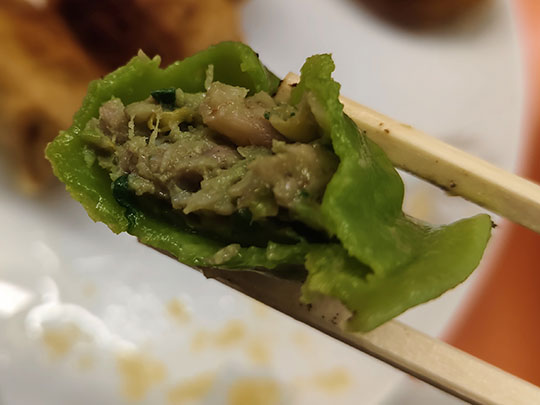 เกี๊ยวซ่าทอดที่นี่ทำเป็นก้อนแบบนี้ดูแล้วต่างจากเกี๊ยวซ่าแบบที่พบได้ทั่วไปส่วนใหญ่ในญี่ปุ่น เรียกว่าเป็นแบบ