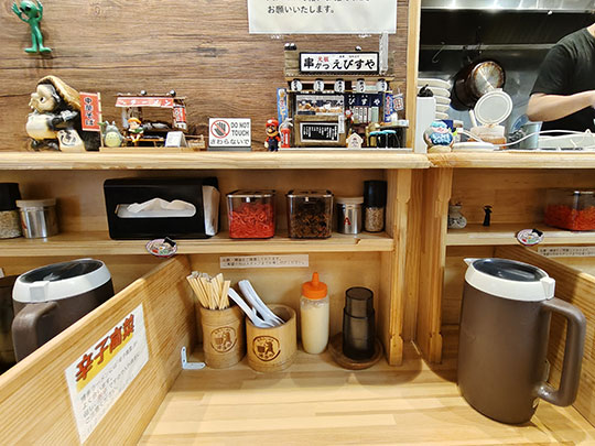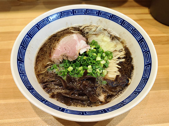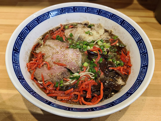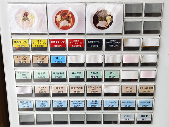เมนูของร้านจากเครื่องขายตั๋ว ฮากาตะราเมงธรรมดาพื้นฐานคือ ๗๕๐ เยน และมีแบบใส่เครื่องปรุงเผ็ดเป็นสีแดง และแบบใส่น้ำมันกระเทียมมายุเป็นสีดำ ราคา ๘๐๐ เยน เราเลือกอันนี้