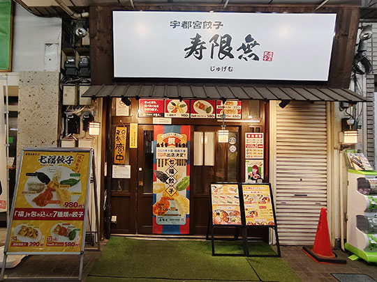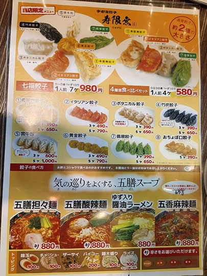 宇都宮餃子寿限無) ร้านเกี๊ยวซ่าขึ้นชื่อร้านหนึ่งของเมืองนี้ โดดเด่นด้วยเกี๊ยวซ่าหลากสี และมีราเมงด้วย