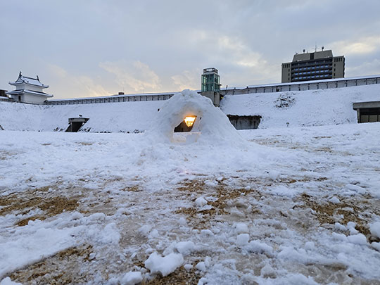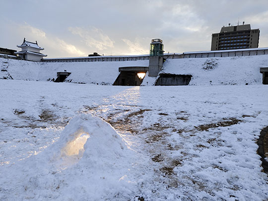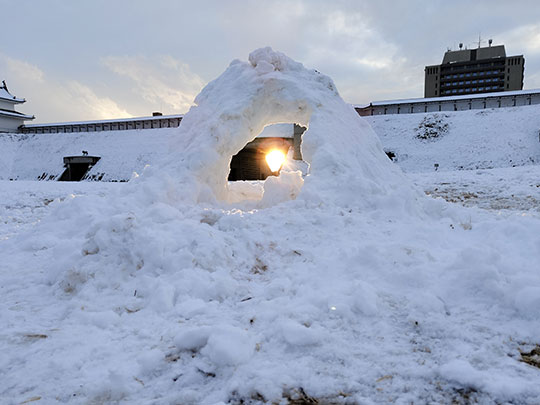 แสงอาทิตย์ยามเย็นลอดผ่านประตูและอุโมงค์หิมะที่ปราสาทอุตสึโนมิยะ