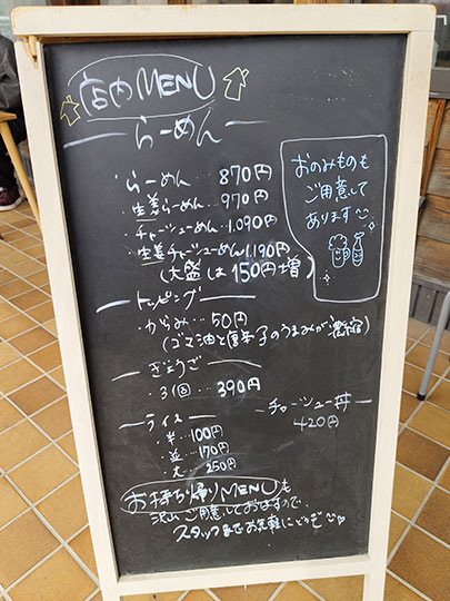 เมนู ซาโนะราเมงแบบพื้นฐานราคา ๘๗๐ เยน และยังมีแบบใส่ขิง ราคา ๙๗๐ เยน นอกจากนี้ก็มีเกี๊ยวซ่า ๓ ชิ้นราคา ๓๙๐ เยน