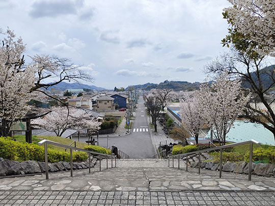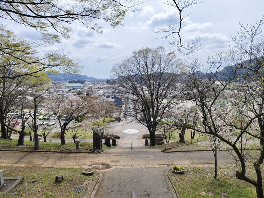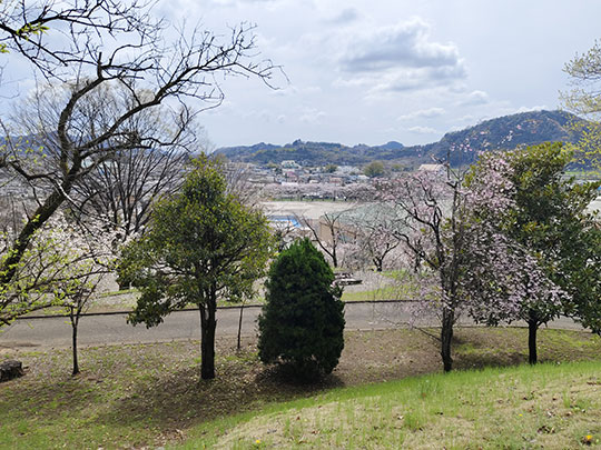 ขึ้นมาด้านบนแล้วมองลงมาเห็นทิวทัศน์ที่เต็มไปด้วยต้นซากุระข้างล่างสวยงามมาก