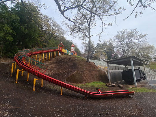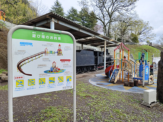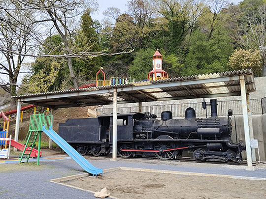 ตรงนี้เป็นสวนเด็กเล่น และมีตู้รถไฟพลังไอน้ำเก่าจอดอยู่ด้วย