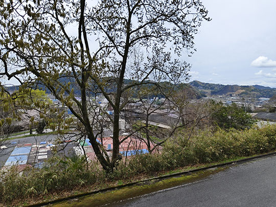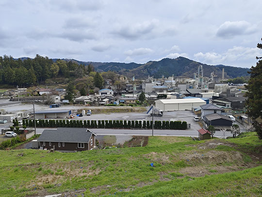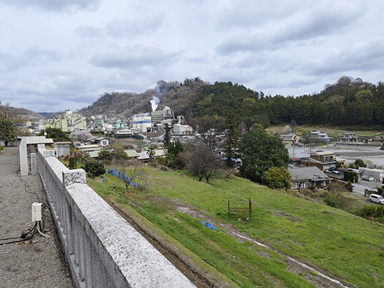 จากบริเวณศาลเจ้ามองเห็นทิวทัศน์ในเมือง โดยมองไปพบว่าเต็มไปด้วยโรงงาน เห็นกำลังพ่นควันอยู่เลย ที่ได้กลิ่นเหมือนกลิ่นไหม้อยู่ในเมืองก็น่าจะเกี่ยวข้องกับโรงงานเหล่านี้ ทิวทัศน์จึงดูแล้วไม่อาจพูดว่าสวยได้อย่างเต็มปาก