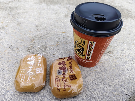 ตรงนี้มีแจกมิโสะมันจูให้ฟรีด้วย แต่เขาก็ขอให้อุดหนุนซื้อกาแฟ แม้ว่าจะไม่บังคับก็ตาม ก็เลยซื้อกาแฟสักหน่อย ราคาแค่ ๑๐๐ เยน