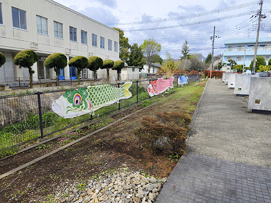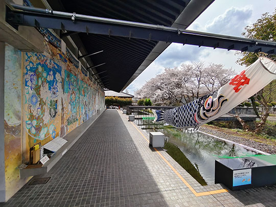 กำแพงอาคารวาดภาพประดับสวยงามมาก แล้วก็มีปลาโค่ยแขวนอยู่สวยดี