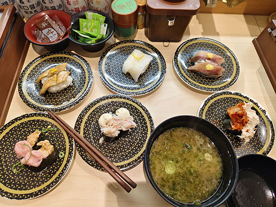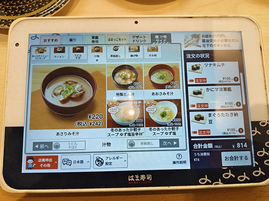 ร้านนี้เป็นซูชิสายพานหมุน แต่ว่าเวลาสั่งต้องมาสั่งกับแท็บเล็ต แล้วของที่สั่งจึงเลื่อนมาตามสายพาน