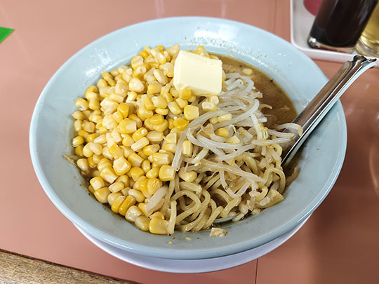 เห็นมีราเมงมิโสะที่มีแต่ข้าวโพดและเนย ไม่มีเนื้อเลย ๑๒๐๕ เยน ดูแปลกดีก็เลยลองเลือกอันนี้ ก็อร่อยดี ปกติราเมงมักใส่เนื้อหมู แต่กินแบบไม่มีเนื้อมีแต่ข้าวโพดแบบนี้ก็ดูไม่เลวเหมือนกัน