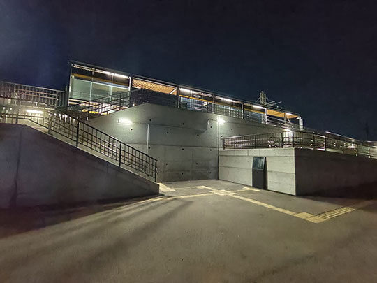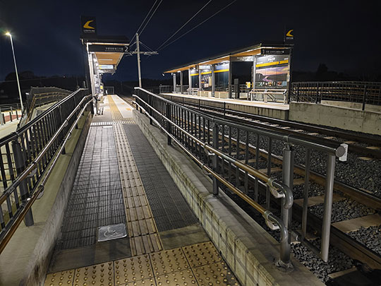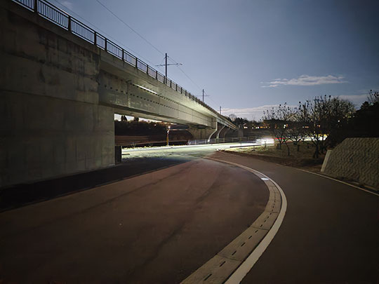 เริ่มมองเห็นทางยกระดับที่เป็นเส้นทางรถราง ปกติแล้วเส้นทางส่วนใหญ่รถรางจะวิ่งกลางถนนที่รถยนต์ทั่วไปวิ่ง แต่ว่าตรงช่วงนี้เป็นเส้นทางพิเศษสำหรับรถรางวิ่งโดยเฉพาะ