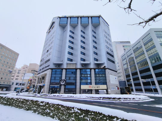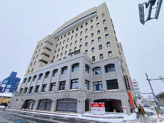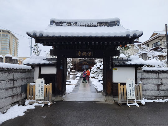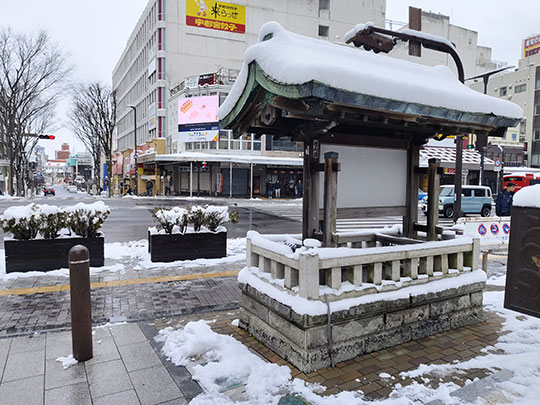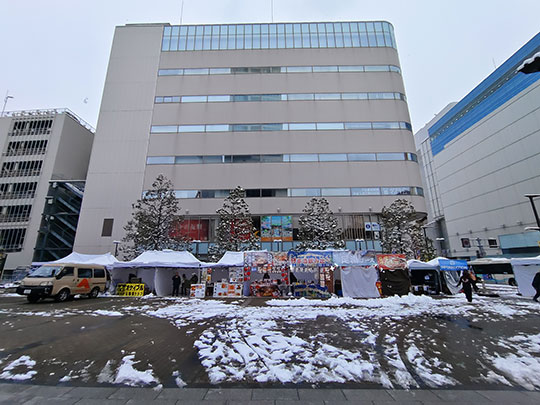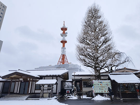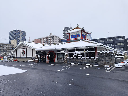 หลังจากออกมาจากที่พัก ระหว่างที่เดินไปยังสถานีก็เจออาคารที่มีรูปร่างสวยเด่นแบบจีน นี่คือร้านอาหารจีน ซันเซนโรว (山泉楼さんせんろう) ปกติหลังคาเป็นสีเขียว แต่วันนี้หิมะปกคลุมขาวโพลน