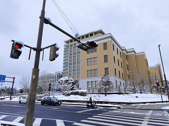 เดินเสร็จออกมาจากอาคาร จังหวะนั้นเห็นหิมะตกจากอาคารลงมาพอดี ซึ่งตรงข้างๆอาคารก็มีติดป้ายบอกอยู่ว่าให้ระวังหิมะตก ไม่ให้เข้าใกล้