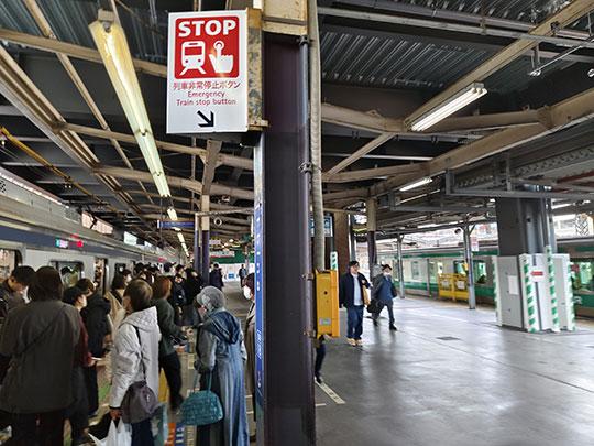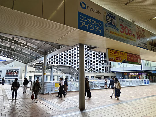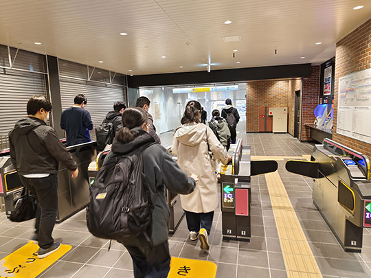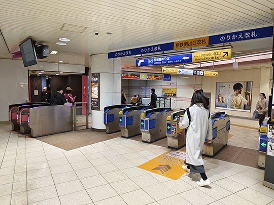 ก่อนอื่นต้องเดินผ่านที่ตรวจตั๋วออกมาก่อนเพราะว่าเปลี่ยนรถไฟคนละบริษัท และไม่ได้เชื่อมต่อกันโดยตรงเหมือนอย่างที่สถานียามาโตะ