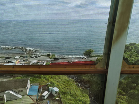 หลังออกจากสถานีมาทางรถไฟตรงนี้ยกระดับสูง และมองลงไปเห็นสะพานแดงกับทะเลสวย แต่ว่ามีตาข่ายกั้นทำให้มองเห็นข้างนอกไม่ชัด แต่ก็พอจะถ่ายภาพมาได้