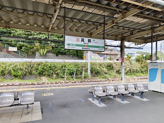 แล้วรถไฟก็มาจอดที่สถานีมานาซึรุ (真鶴駅まなづるえき) ซึ่งตั้งอยู่ในเมืองมานาซึรุ (真鶴町まなづるまち)