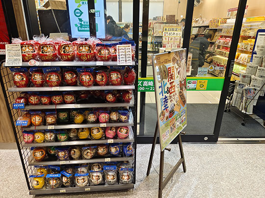 ก่อนไปขึ้นรถฟก็มาแวะร้านสะดวกซื้อข้างในเพื่อซื้อชาสักหน่อย เห็นมีขายพวกตุ๊กตาดารุมะของขึ้นชื่อของทากาซากิเต็มเลย