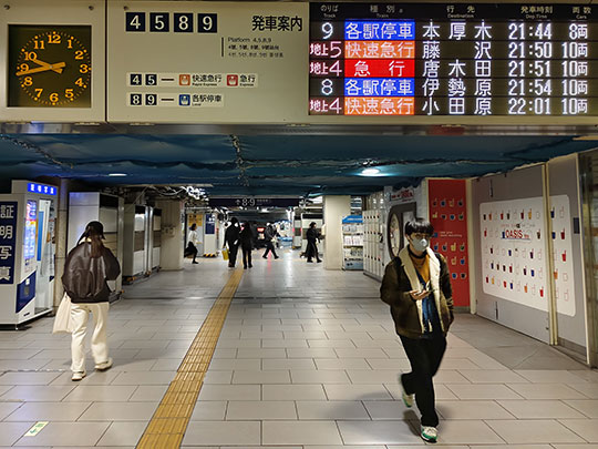 มาขึ้นรถไฟแบบด่วนที่มีปลายทางที่สถานีฟุจิซาวะ รอบ 21:50