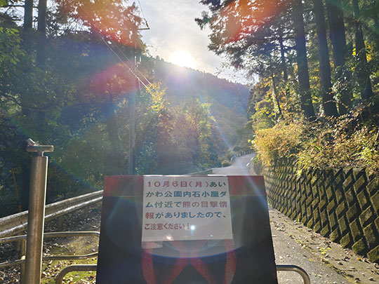 ตรงนี้มีทางเดินข้างสวนสาธารณะที่เขียนว่ามีคนพบหมี ให้ระวังด้วย