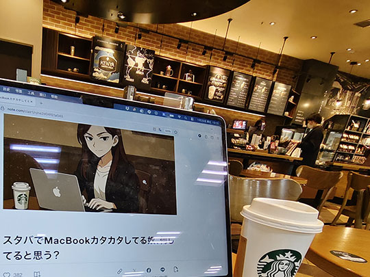 ที่จริงเป็นเพราะวันก่อนเพิ่งคุยกับเพื่อนที่ทำงานไปว่าเราใช้แมค แล้วเขาก็พูดว่าเอาแมคไปนั่งเล่นที่สตาร์บัคส์ดูเท่ดีนะ ก็เลยอยากลองทำจริงสักหน่อย อันที่จริงเราชอบนั่งร้านโดโตร์ (ドトール) มากกว่า เพราะถูกกว่ามาก ดังนั้นตอนอยู่ญี่ปุ่นไม่เคยเข้าสตาร์บัคส์เลย แต่ว่าในอุตสึโนมิยะไม่มีโดโตร์เลย น่าเสียดาย