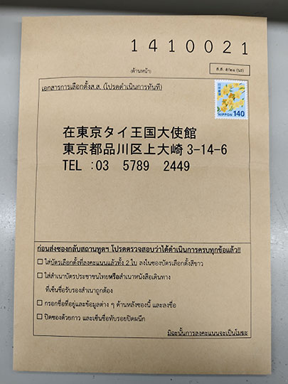สำหรับคนที่อยู่ญี่ปุ่นนั้นสถานทูตไทยที่โตเกียวเป็นคนจัดการ ใครอยู่ใกล้จะไปทำการเลือกตั้งที่สถานทูตโดยตรงก็ได้ แต่ว่าเราอาศัยอยู่ต่างจังหวัดจึงใช้ไปรษณีย์สะดวกกว่า