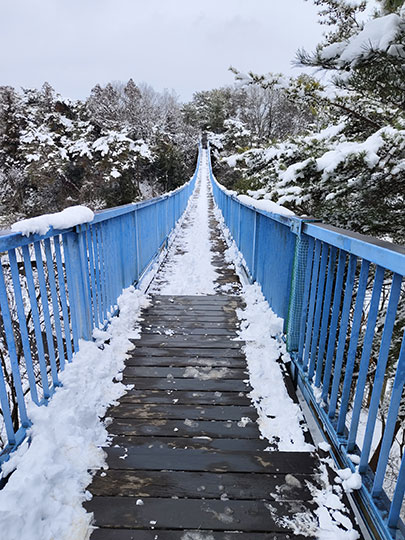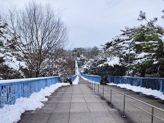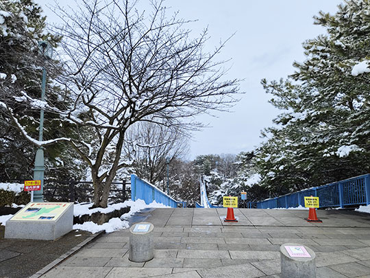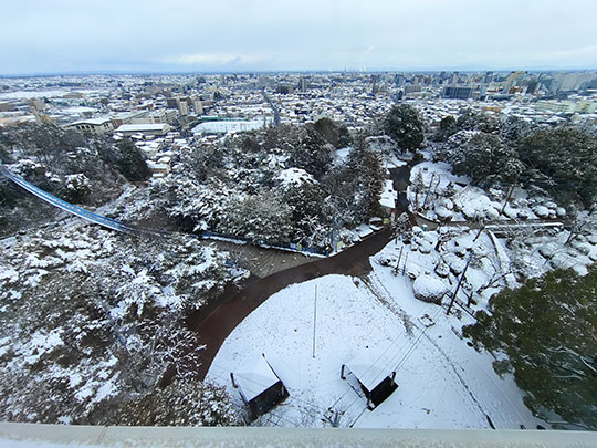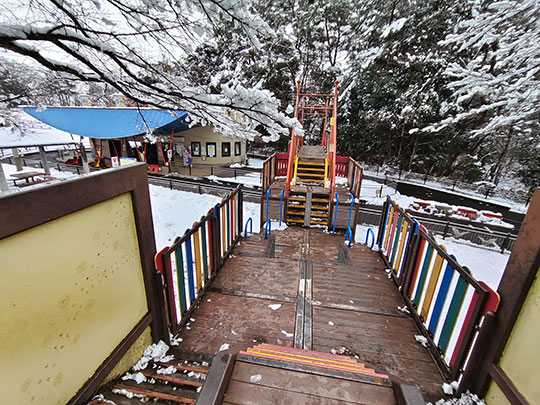 ทิศตะวันออก มองเห็นสะพานที่ทอดผ่านหุบเขาด้วย ตรงนั้นเรียกว่าเป็นแอดเวนเจอร์บริดจ์ (アドベンチャーブリッジ) ยาว ๑๕๐ เมตร เดี๋ยวเราก็จะไปข้ามสะพานนั้น