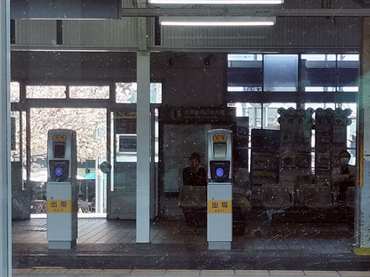 จากในชานชลาลองมองผ่านที่ตรวจตั๋วออกไปก็เห็นซากุระบานอยู่หน้าสถานีด้วย